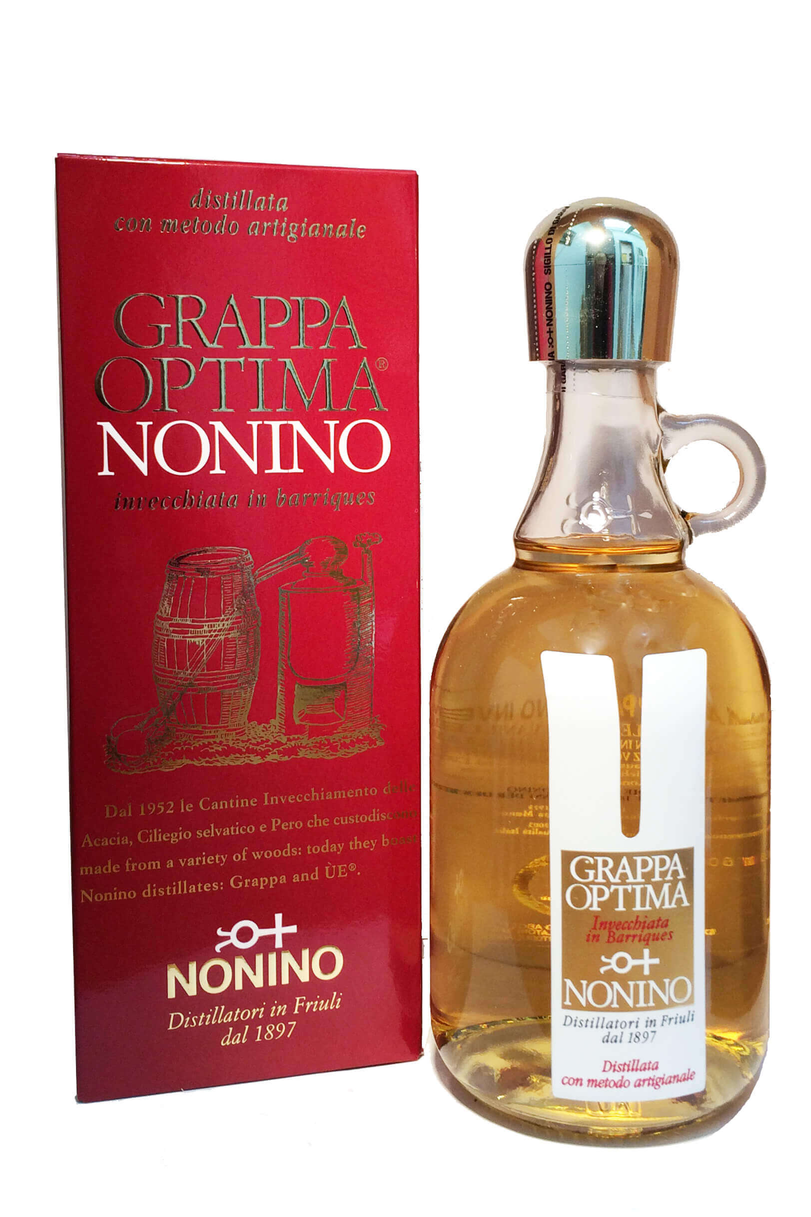 Der Grappa Optima von Nonino wird aus dem Trester der Grave und Colli Friulan Traube hergestellt und bis zu drei Jahre in kleinen Eichenholzfässern gelagert. Durch seine Lagerung im Eihenholzfass bekommt er seine hell gelbe Farbe und, für Eichenholz typisch, einen zarten Vanilleduft. er besitzt einen eleganten und stärkeren Geschmack als sein Bruder der Grappa Vuisinar von Nonino.